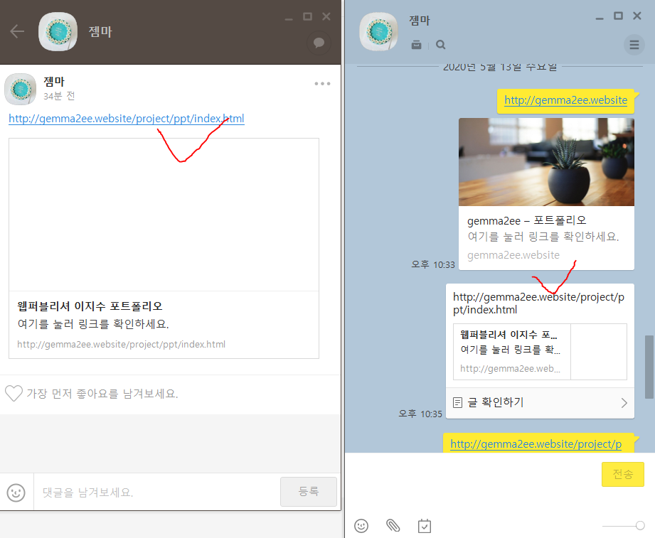 4. 다시 카카오톡으로 와서, URL 공유 테스트 해봅니다.